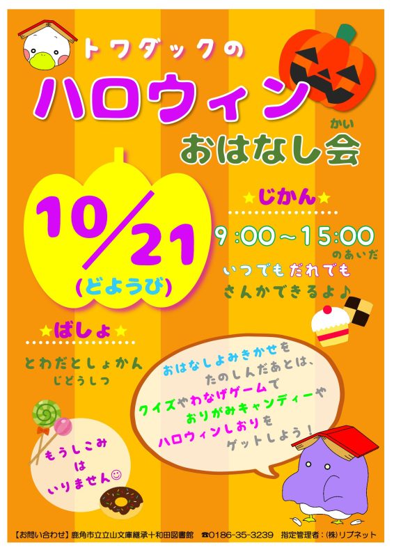 【十和田図書館】10月21日(土)9:00~15:00 トワダックのハロウィンおはなし会