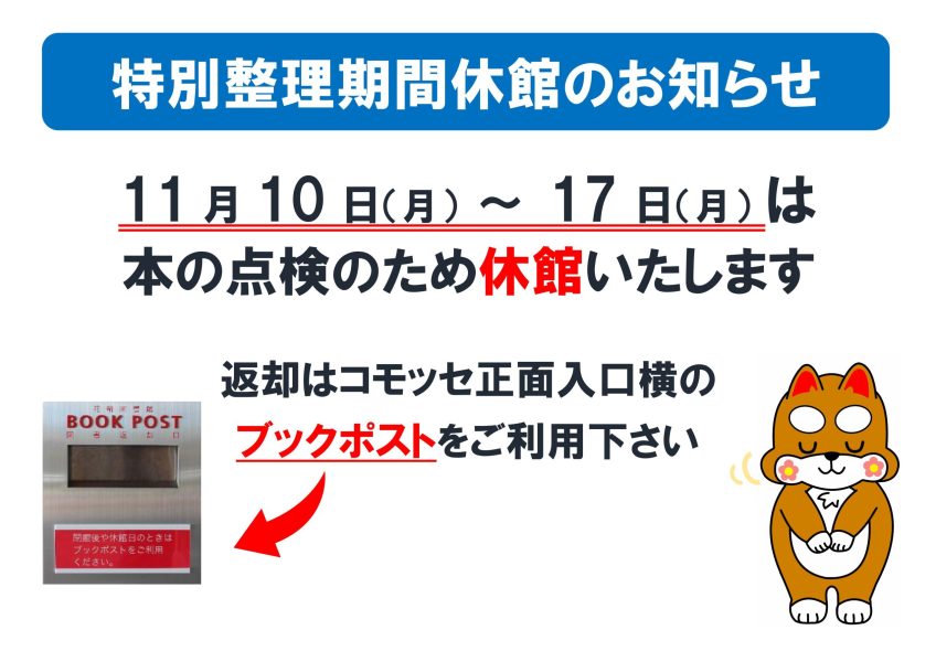 【花輪図書館】11月10日(月)~17日(月) 特別整理期間休館のお知らせ