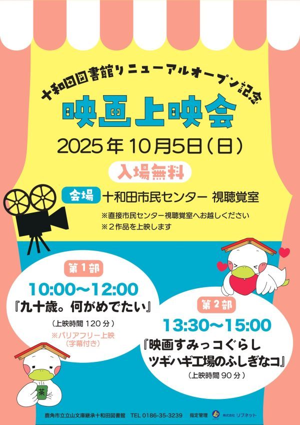 【十和田図書館】10月5日(日) リニューアルオープン記念 「映画上映会」